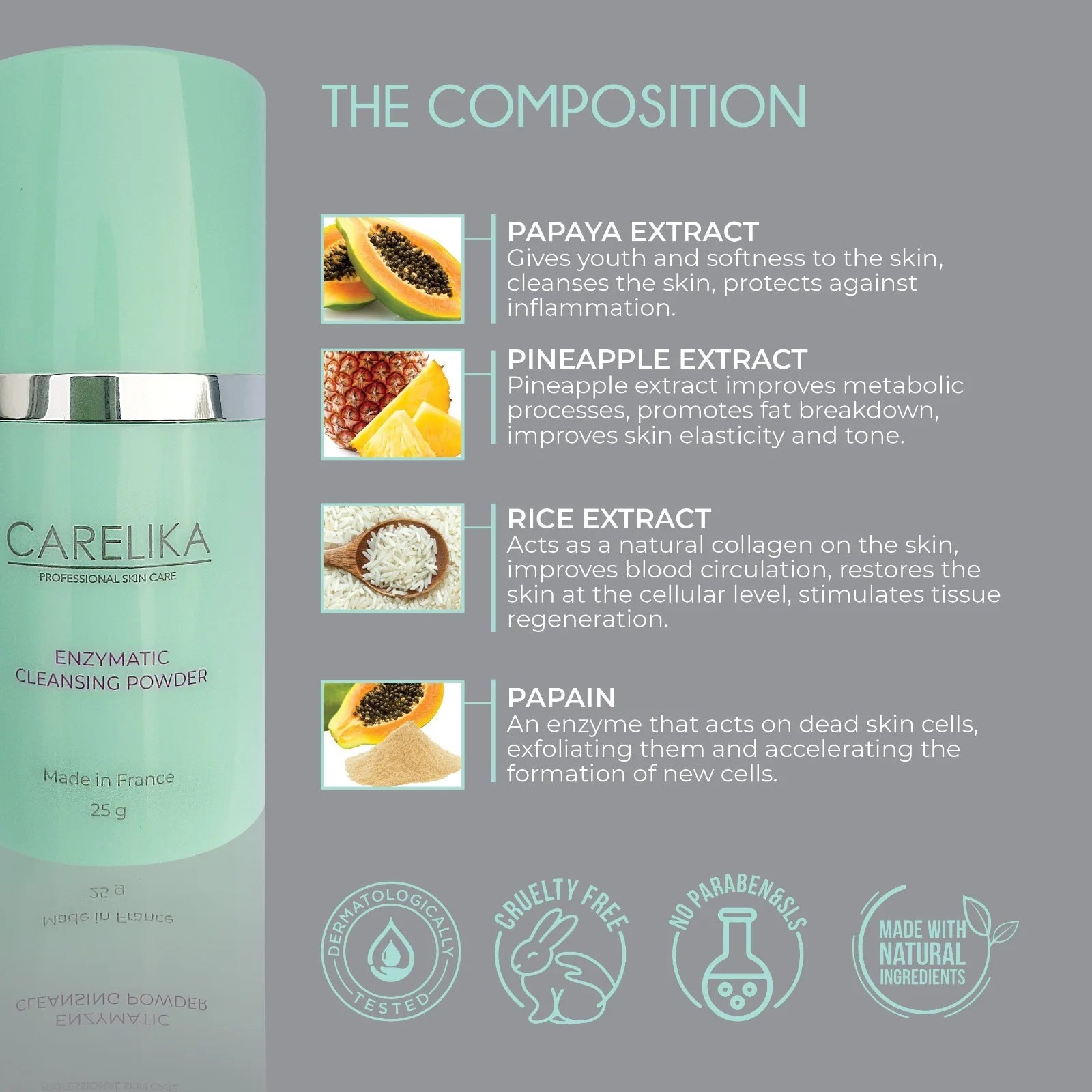 Here are some additional details about the benefits of the ingredients in Enzymatic Cleansing Powder by CARELIKA: